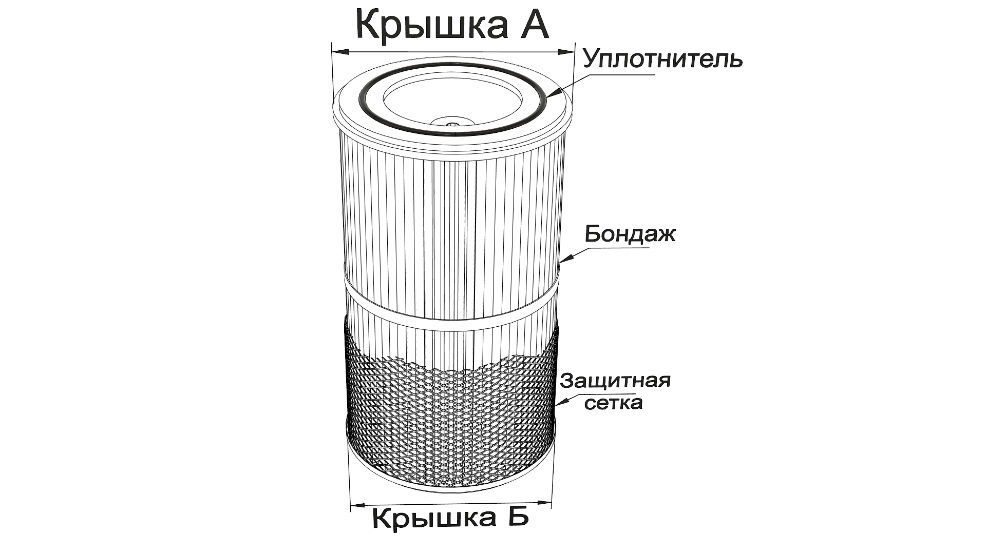 Стандартный фильтр ФВКарт состоит из двух металлических крышек (фланцев) из оцинкованной стали, между которыми уложен фильтрующий материал в виде складок. Вся эта конструкция образует цилиндр, ограниченный глухой крышкой с отверстием под шпильку, с одной стороны, и проходной крышкой (бублик) с резиновым уплотнением – с другой стороны. Фиксация и герметизация фильтровального материала в крышках (фланцах) осуществляется при помощи специального герметика. Для придания фильтру дополнительной прочности, внутри фильтра крепят металлическую опорную сетку, а внешнюю сторону фильтра стягивают бандажными поясами, тем самым фиксируя гофры между собой.